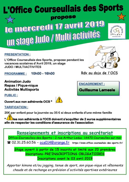 Guillaume organise un stage JUDO / MULTI ACTIVITES le mercredi 17 avril 2019, prioritairement pour les adhérents de la section JUDO, de 10h à 16h. RDV au DOJO de l'OCS.