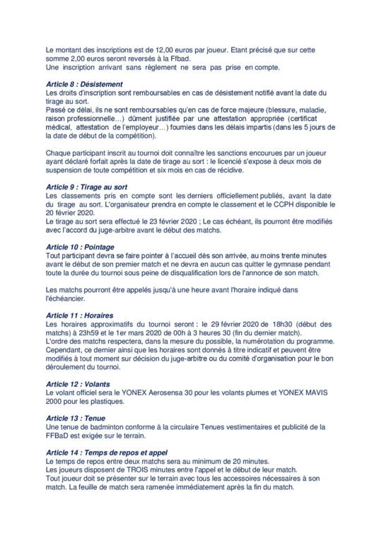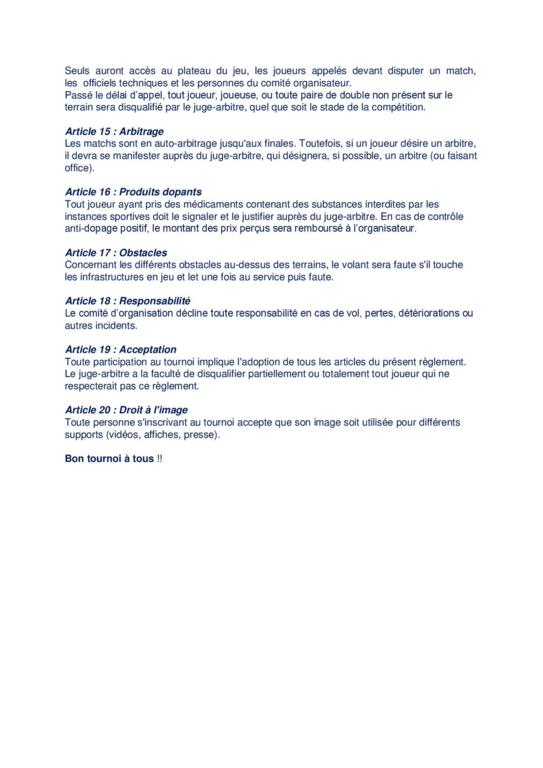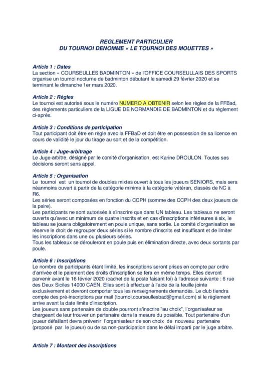 Tout participant doit être en règle avec la FFBaD et doit être en possession de sa licence en cours de validité le jour du tirage au sort et de la compétition.