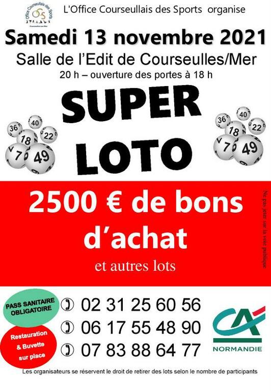 L'Office Courseullais des Sports organise le samedi 13 novembre 2021, un SUPER LOTO à 20h à la Salle de l'Edit de Courseulles-sur-Mer.